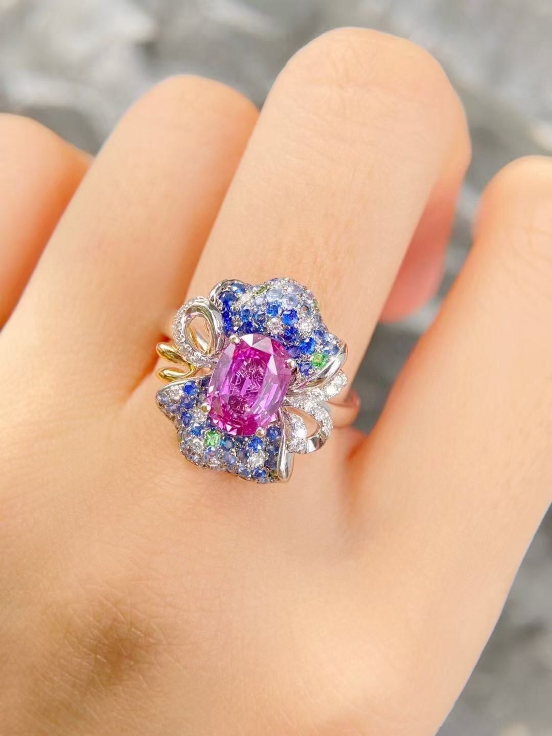 その周囲を彩るのは、まるでリボンが優しく舞っているような曲線美。繊細なフォルムに沿って、ブルー、グリーンのサファイアがパヴェセッティングされ、華やかさと遊び心を添えています。