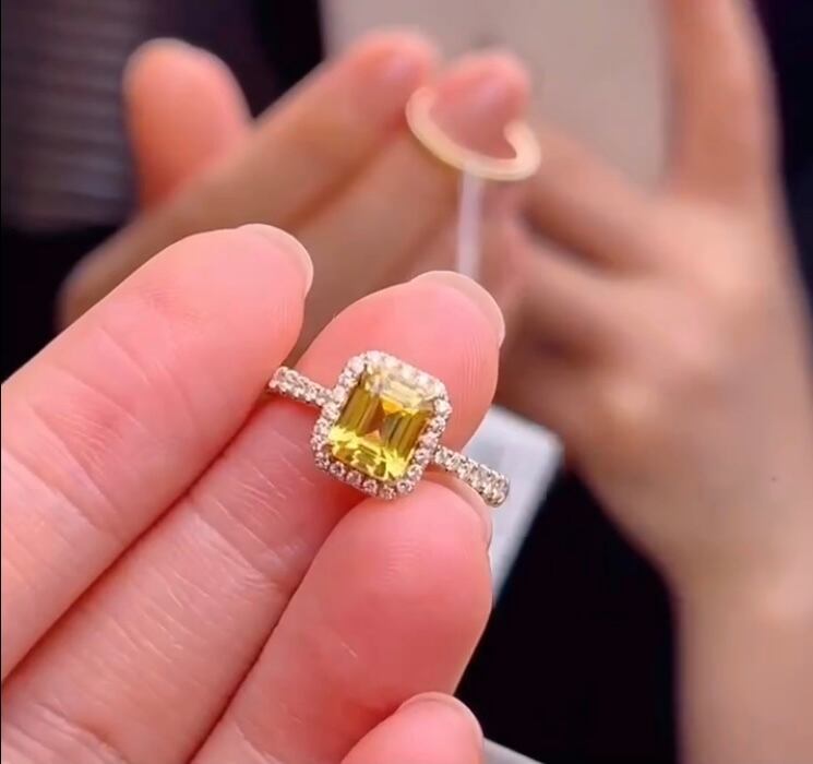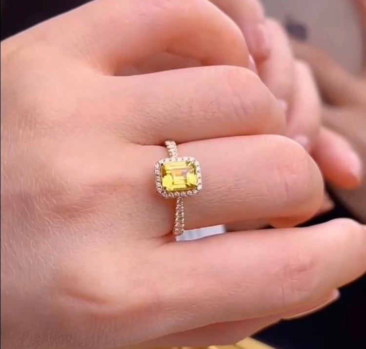 輝きが素晴らしい1.55ctのエメラルドカットを品良くダイヤで巻きました